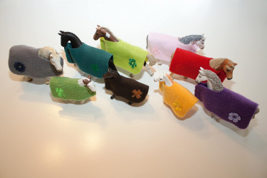 Es ist windig draußen, teilweise richtig stürmisch. Zu Weihnachten hatten unsere Schleich-Pferde einen Stall bekommen. Da das Christkind für die kleine Pferdeliebhaberin aber nicht nur den Stall, sondern auch neue Pferde auf den Hof gebracht hat, war dieser schnell zu klein... Sie gehen deshalb abwechselnd in den Stall zum Aufwärmen. Im Normalfall braucht ein Pferd ja keine Decke, wohl aber viel Bewegung und frische Luft. Aber für den Fall der Fälle, das doch mal eins friert, haben sie nun hübsche Pferdedecken mit Klettverschluss genäht bekommen.