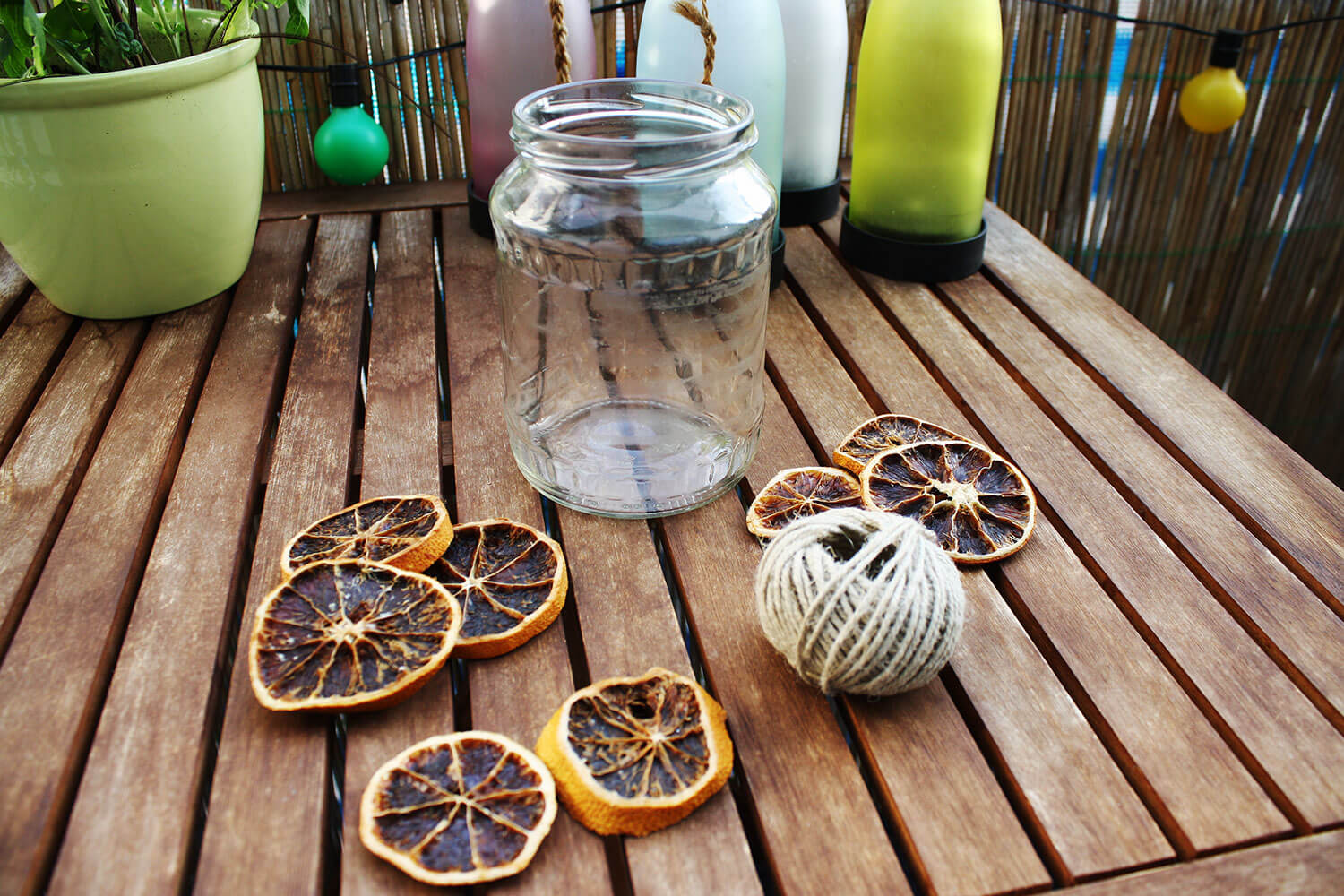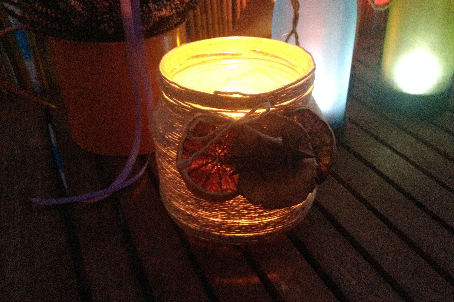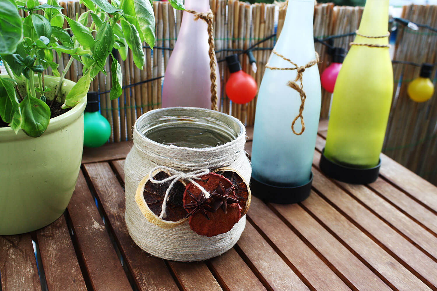Ein altes Glas hat fast jeder zu Hause. Mit Paketfaden ist es ganz schnell aufgehübscht. Zunächst habe ich Kleber auf dem Glas angebracht und den Paketfaden fest um das Glas gewickelt, so dass kaum Lücken zu sehen waren. Sobald das Band komplett um das Glas gewickelt ist, lasst ihr es am besten etwas trocknen. Danach könnt ihr eurer Kreativität freien Lauf lassen und beliebige Dekoelemente anbringen. Ich habe dazu Orangen in Scheiben geschnitten und getrocknet. Lediglich für’s Trocknen der Orangen müsst ihr etwas Zeit einplanen. Sind sie erst mal fertig, sind sie ganz schnell mit etwas Paketband angebracht. Teelicht rein. Fertig.
