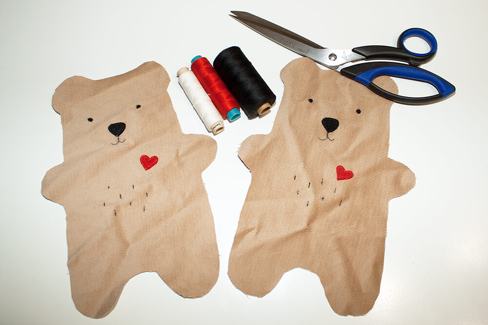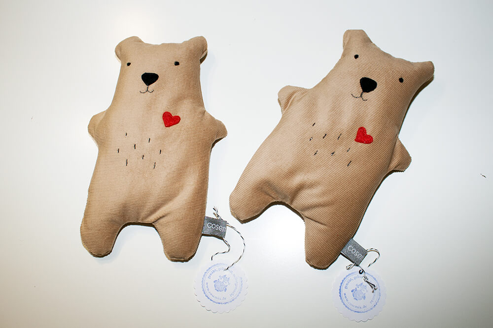 Eine Freundin hat kürzlich Zwillinge bekommen. Für die beiden Mäuschen habe ich gern individuelle Körnerkissen aus Cord-Stoff genäht. Süße Bärchen, oder? Sie sind mit Rapssamen gefüllt und auf die Rückseite habe ich jeweils die Namen und das Geburtsdatum gestickt.