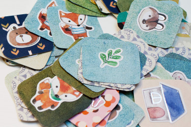 Bei der Zusammenstellung der Memorys gibt es keine Grenzen. Es können zum Beispiel unterschiedliche Fotos von Gegenständen, Orten, Tieren oder von der Familie sein, oder in unserem Fall kleine Sticker in zweifacher Ausfertigung. Auswahlkriterium ist allerdings, dass sie sich quadratisch zuschneiden lassen. Bei kleinen Kindern sollte das Bild möglichst nur ein Hauptmotiv umfassen. Je nach Alter des Beschenkten können die Motive kleiner und umfangreicher sein.