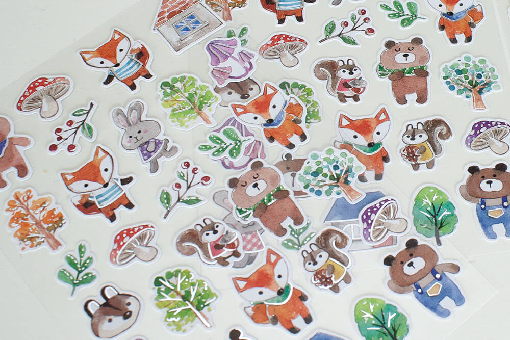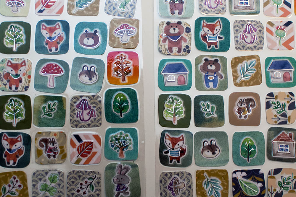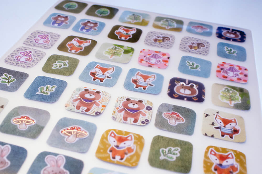 Bei der Zusammenstellung der Memorys gibt es keine Grenzen. Es können zum Beispiel unterschiedliche Fotos von Gegenständen, Orten, Tieren oder von der Familie sein, oder in unserem Fall kleine Sticker in zweifacher Ausfertigung. Auswahlkriterium ist allerdings, dass sie sich quadratisch zuschneiden lassen. Bei kleinen Kindern sollte das Bild möglichst nur ein Hauptmotiv umfassen. Je nach Alter des Beschenkten können die Motive kleiner und umfangreicher sein.