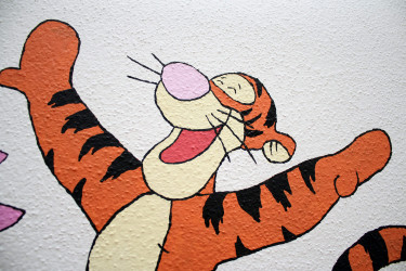 Zugegebenermaßen war es eine schwierige Entscheidung, festzulegen, welches Bild an die Wand ins Kinderzimmer kommt. Es gibt ja so unendlich viele Möglichkeiten. Die Entscheidung fiel dann auf Winnie Puuh, Tigger und Co. auf einer Lokomotive. Ich mag den liebenswerten, gemütlichen Bären, auch wenn er in diesem Fall mit einer Lokomotive und nicht mit seiner großen Leidenschaft für Honig abgebildet ist. Also habe ich kurzerhand die Umrisse mittels Bleistift an die Wand übertragen. Ein Beamer für die Projektion der Umrisse erleichtert die Arbeit dabei ungemein ;) So fing alles an: