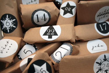 Ich habe Vorlagen für die Adventskalenderzahlen genutzt und viele kleine Päckchen mit Packpapier verpackt.